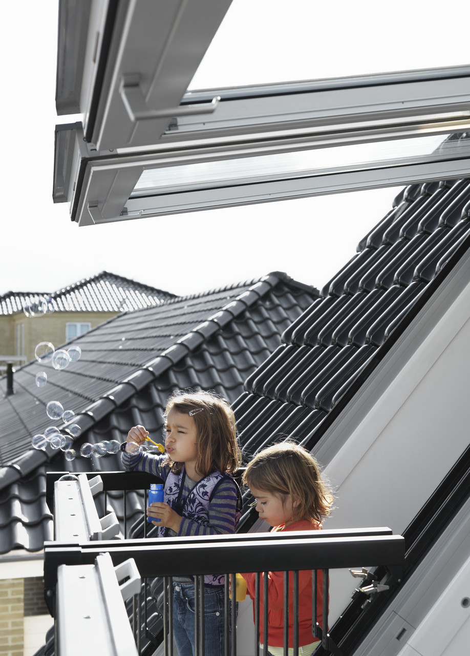 Velux Преміум CABRIO® «Тераса» — мансардне вікно, яке трансформується в затишний балкон. Така особливість конструкції дозволить насолодитися панорамним виглядом та створити оригінальний дизайн у вашому будинку. Достатньо підняти верхню секцію, висунути нижню та виходить повноцінний балкон. Це ідеальний спосіб облаштувати комфортну зону відпочинку на мансарді!
